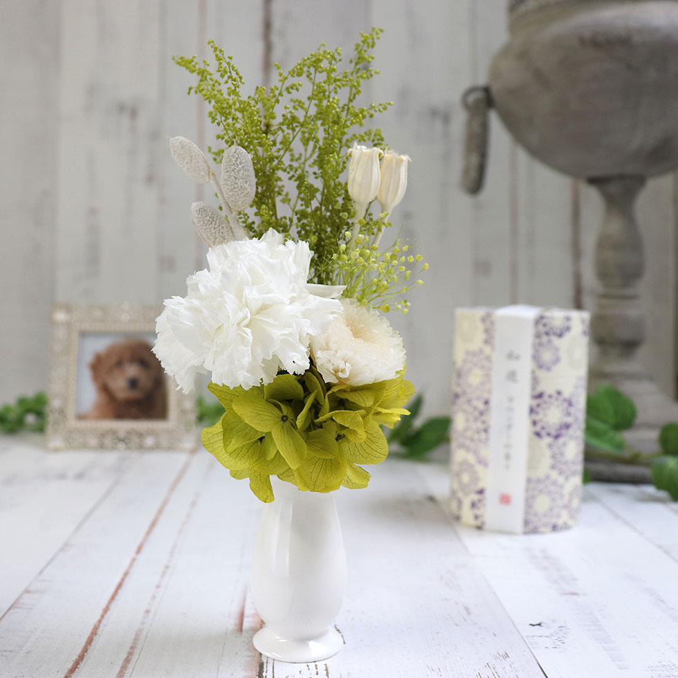 喪中見舞い 線香 花器付 プリザーブドフラワー 仏花 仏壇用 納骨堂 プリザーブド ミニ お仏壇 お彼岸 お供え物 お悔やみ お供え 線香 お線香 桐箱 喪中 見舞い 贈り物 花 初盆 お供え お供え物 プリザーブドフラワー セット 「穏やかな思い出と線香セット」ペット 犬 猫