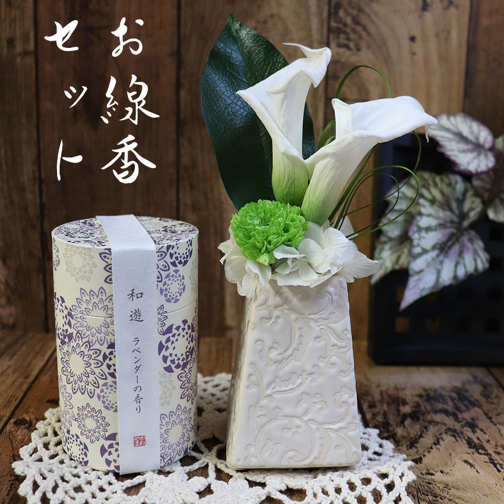 喪中見舞い 線香 花器付 プリザーブドフラワー 仏花 仏壇用 納骨堂 プリザーブド ミニ お仏壇 お彼岸 お供え物 お悔やみ お供え 線香 お線香 桐箱 喪中 見舞い 贈り物 花 初盆 お供え お供え物 プリザーブドフラワー セット 「やすらぎの華と線香セット」ペット 犬 猫