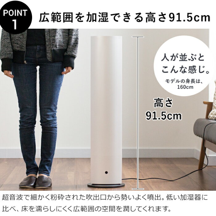 舞い降りるミストで乾燥対策、いかがでしょうか? 超音波で細かく粉砕された水を高さ91.5cmの吹出口から勢いよく噴出。